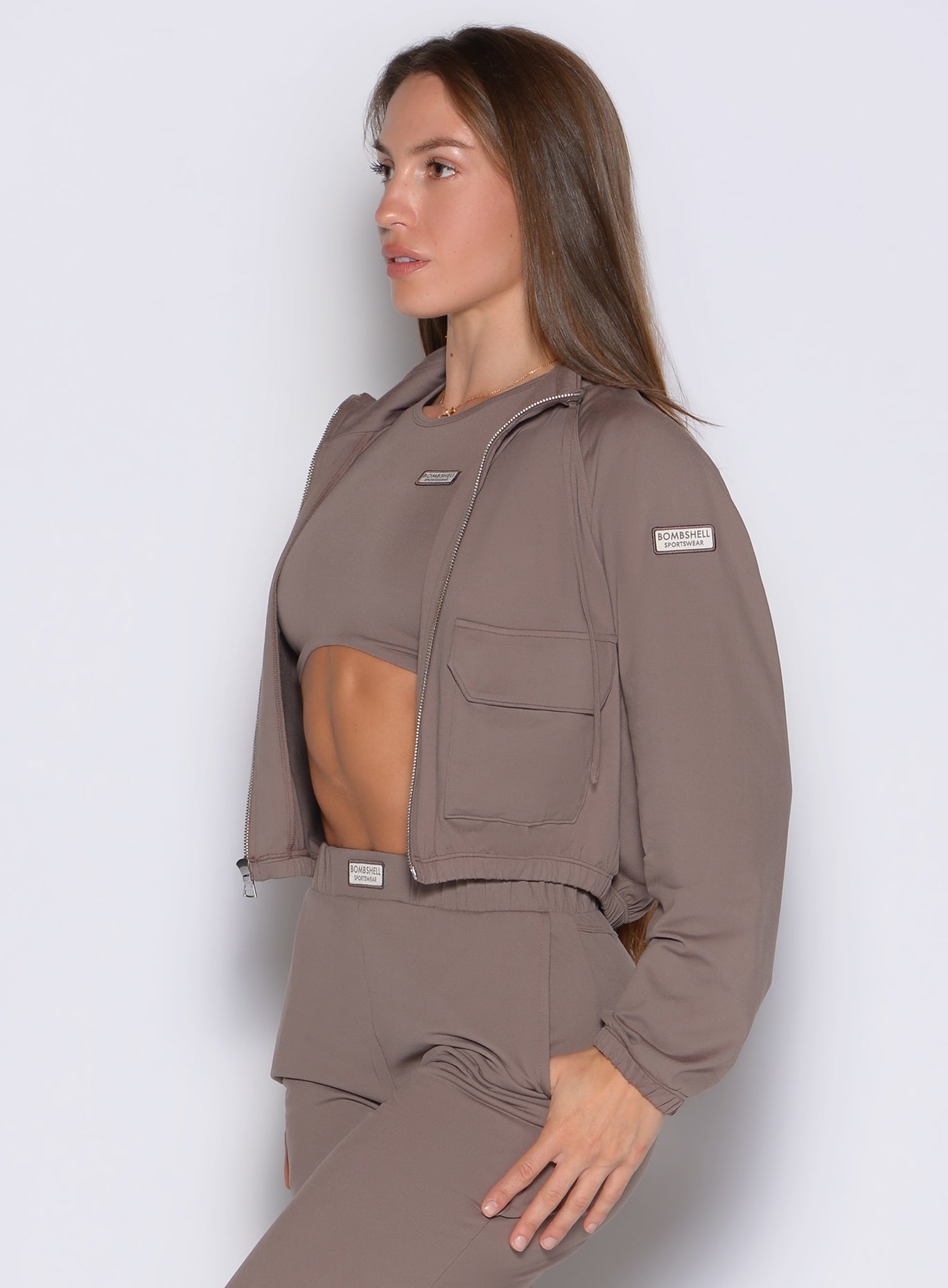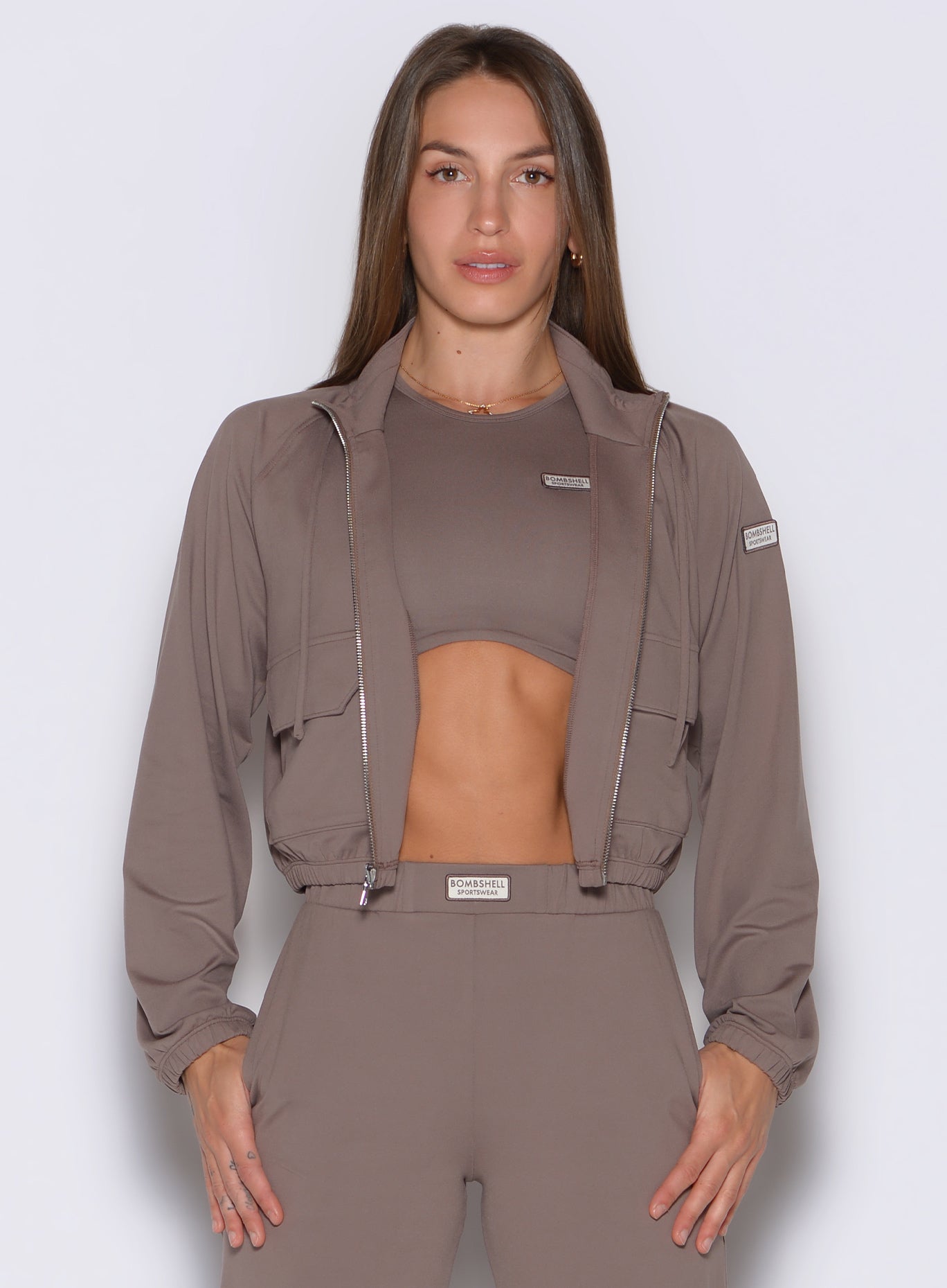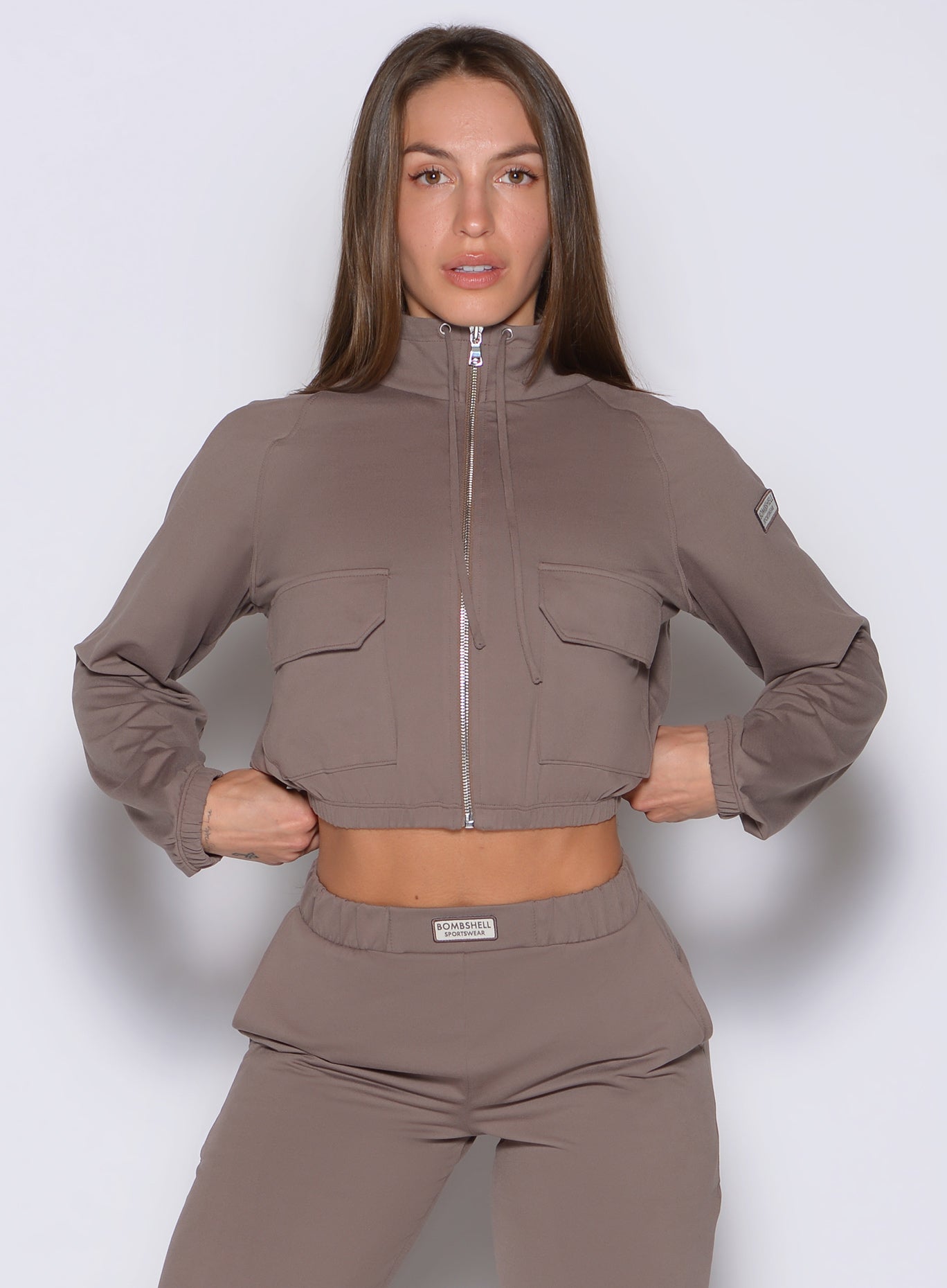 Elevated lounge meets effortless style. Soft. sleek. and perfectly balanced — fitted yet loose with a high neck. front zip. side pockets. and cinched cuffs. The ultimate mix of comfort and confidence.