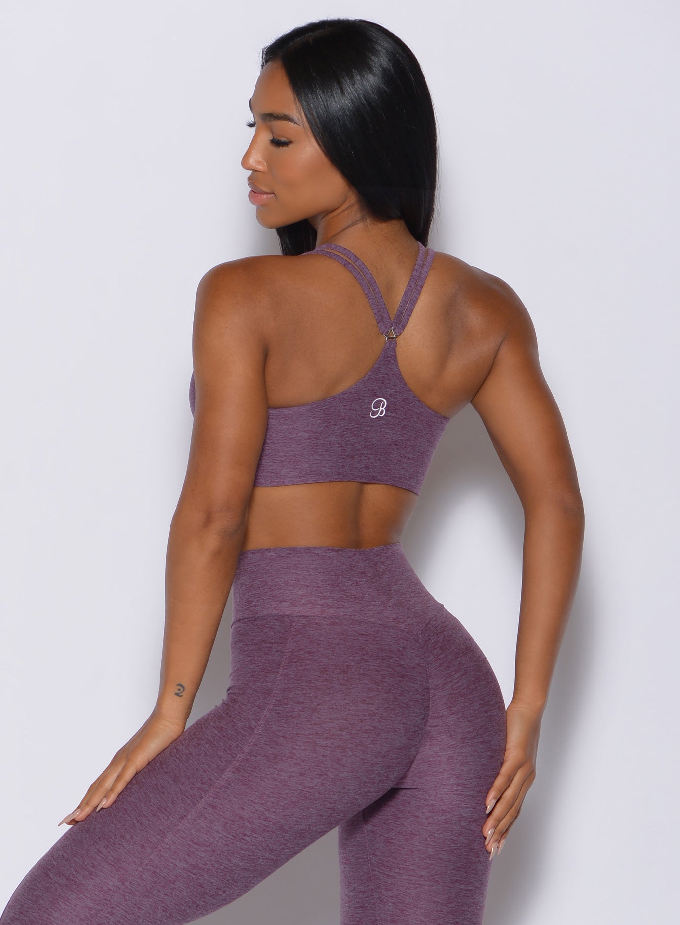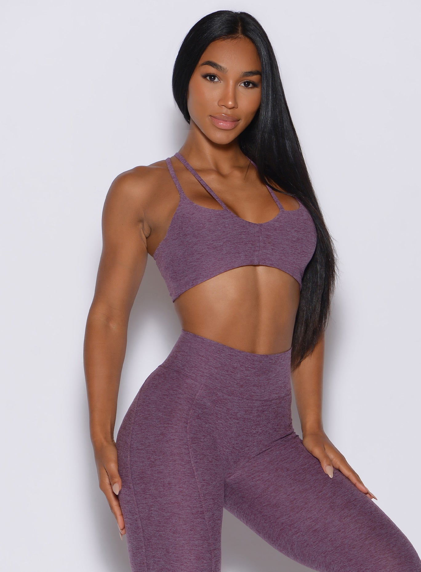 The Top Notch Bra in Regal Purple brings bold color and modern design to your activewear lineup. Crafted as a light support sports bra. it features a flattering V cutout front and curved underbust that highlight your shape. Double side straps and a racerback cut offer a secure yet flexible fit. while the cropped length adds a sleek edge. Made with removable pads and soft. breathable fabric. this dark purple sports bra delivers comfort and style whether you are training. lounging. or layering under your favorite Bombshell pieces.